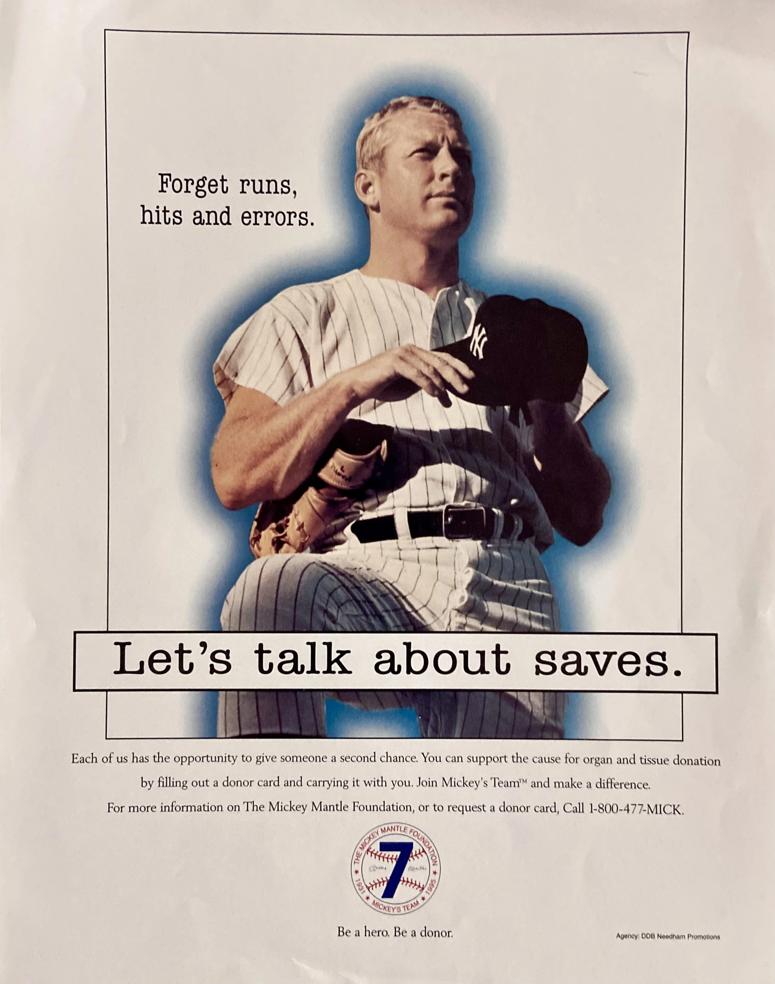 Baseball and fundraising came together in this print ad I wrote for the Mickey Mantle Foundation. The headline is a baseball term that opens up the conversation about giving back.